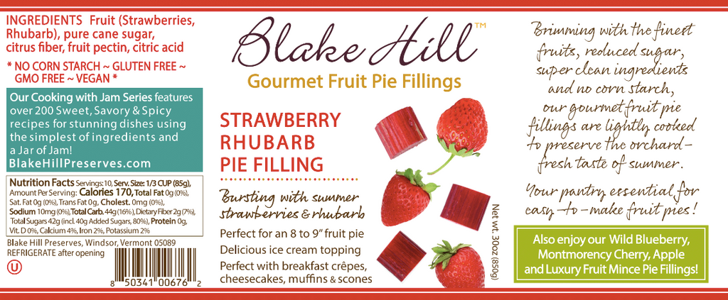 Bursting with summer strawberries and rhubarb, this pie filling is perfect for a 9” fruit pie. We also love using this pie filling in fruit crumble tarts, as a delicious ice cream topping, and as an accompaniment for breakfast crepes, cheesecakes, muffins and scones.