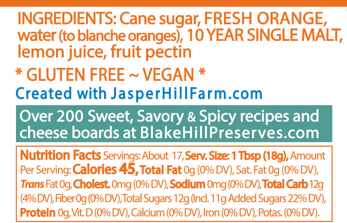 Created with award-winning cheesemakers Jasper Hill Farm, this marmalade pairs the taste of fresh, sweet oranges with the bold, peaty flavor of a world-renowned ten year single malt whisky. This is a rich, sophisticated marmalade that pairs well with hard cheese varieties, like Cabot Clothbound with its caramel nuttiness. A perfect gift for the whisky connoisseur!